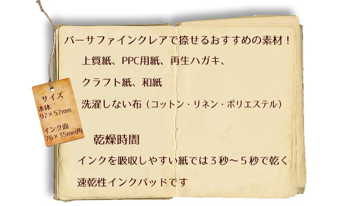 (洗濯する布には、布用インク→バーサクラフトをご使用下さい) 本体サイズ:W97×D57×H23mm/インクパット面 76×35mm メーカー希望小売価格はメーカーカタログに基づいて掲載しています ※クリックでカタログ画像を表示します